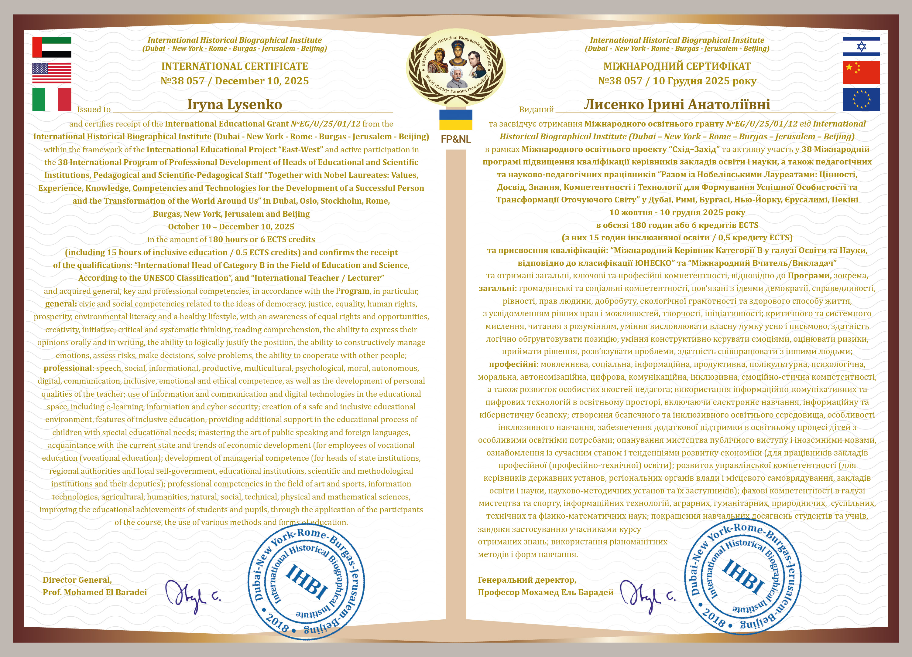 Підвищення кваліфікації за Міжнародною програмою підвищення кваліфікації керівників закладів освіти і науки, а також педагогічних та науково-педагогічних працівників “Разом із Нобелівськими Лауреатами: Цінності, Досвід, Знання, Компетентності і Технології для Формування Успішної Особистості та Трансформації Оточуючого Світу” обсягом 6,0 кредитів ЄКТС (180 годин) The International Historical Biographical Institute (Dubai - New York - Rome - Burgas - Jerusalem - Beijing) з 10 жовтня по 10 грудня 2025 року. Сертифікат №38 057/10 грудня 2025року.