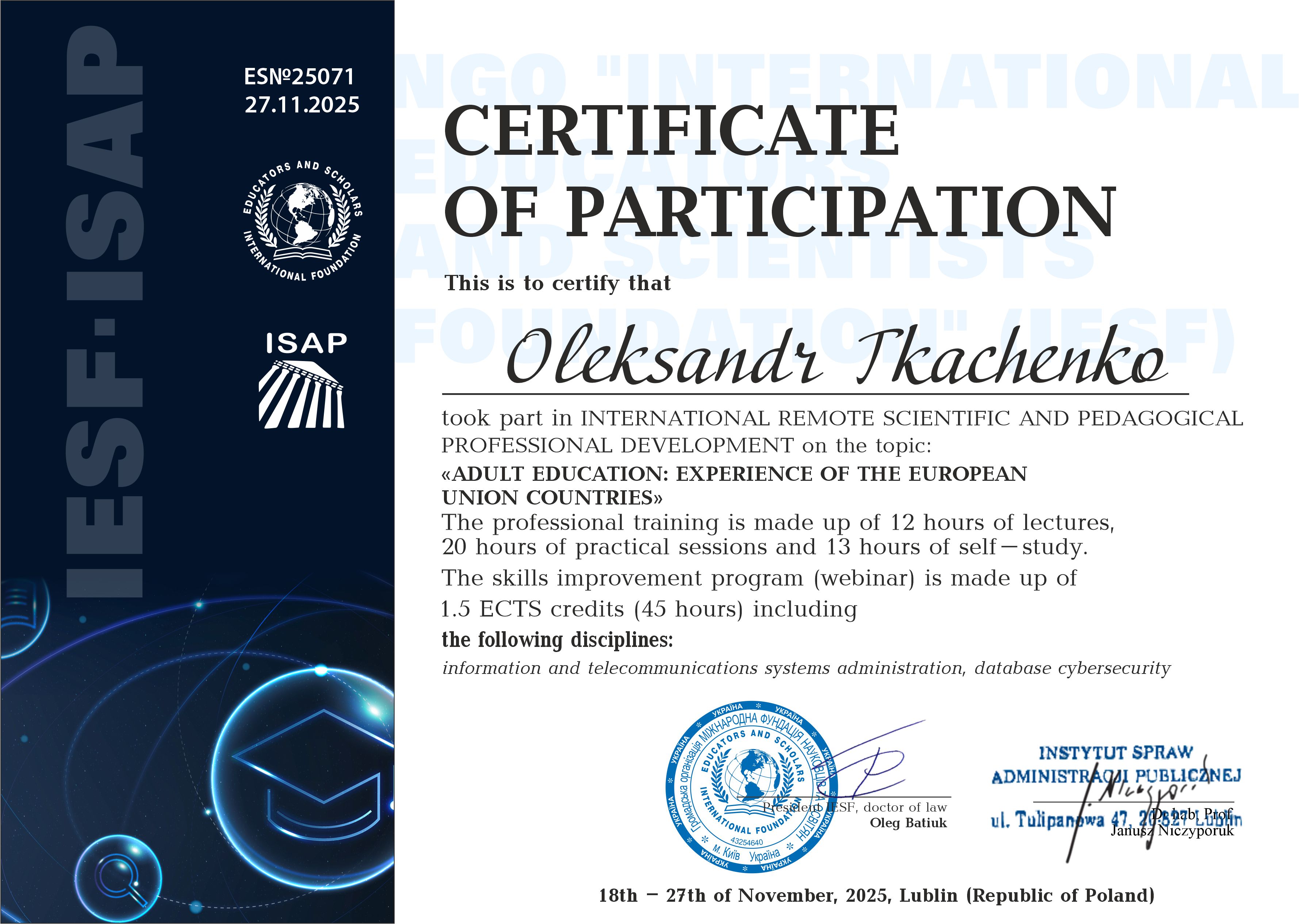 2025 р. Міжнародне підвищення кваліфікації об’ємом 1.5 кредиту ECTS (45 годин). «ТРАНСФЕР ОСВІТНІХ ТЕХНОЛОГІЙ У ПІДГОТОВЦІ МАГІСТРІВ ТА ЗДОБУВАЧІВ ДОКТОРА ФІЛОСОФІЇ (PHD) В КРАЇНАХ ЄВРОПЕЙСЬКОГО СОЮЗУ ТА УКРАЇНІ» , яке було проведено громадською організацією "Міжнародна фундація науковців та освітян. Сертифікат