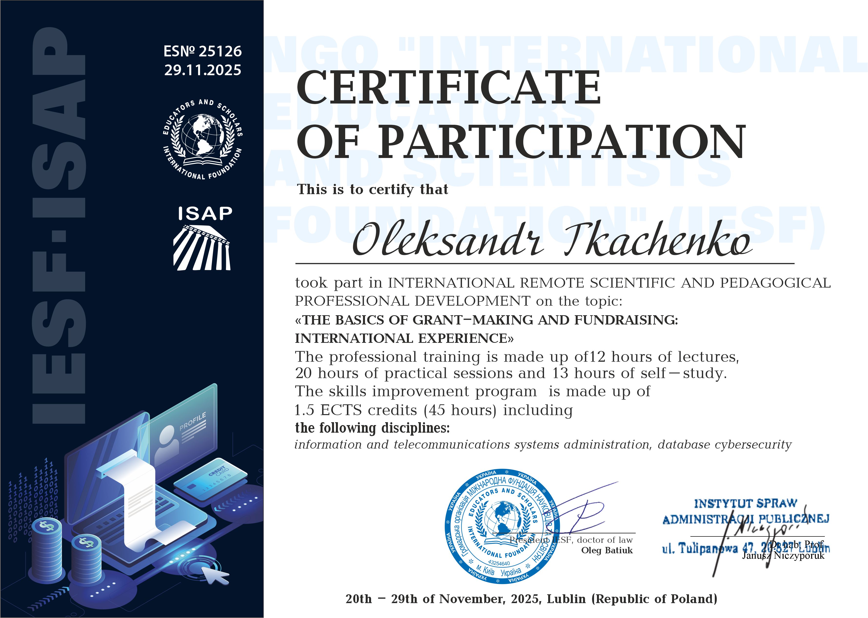 Сертифікат ES №24635 про міжнародне підвищення кваліфікації «ОСНОВИ ГРАНТОВОЇ ДІЯЛЬНОСТІ ТА ФАНДРАЙЗИНГУ: