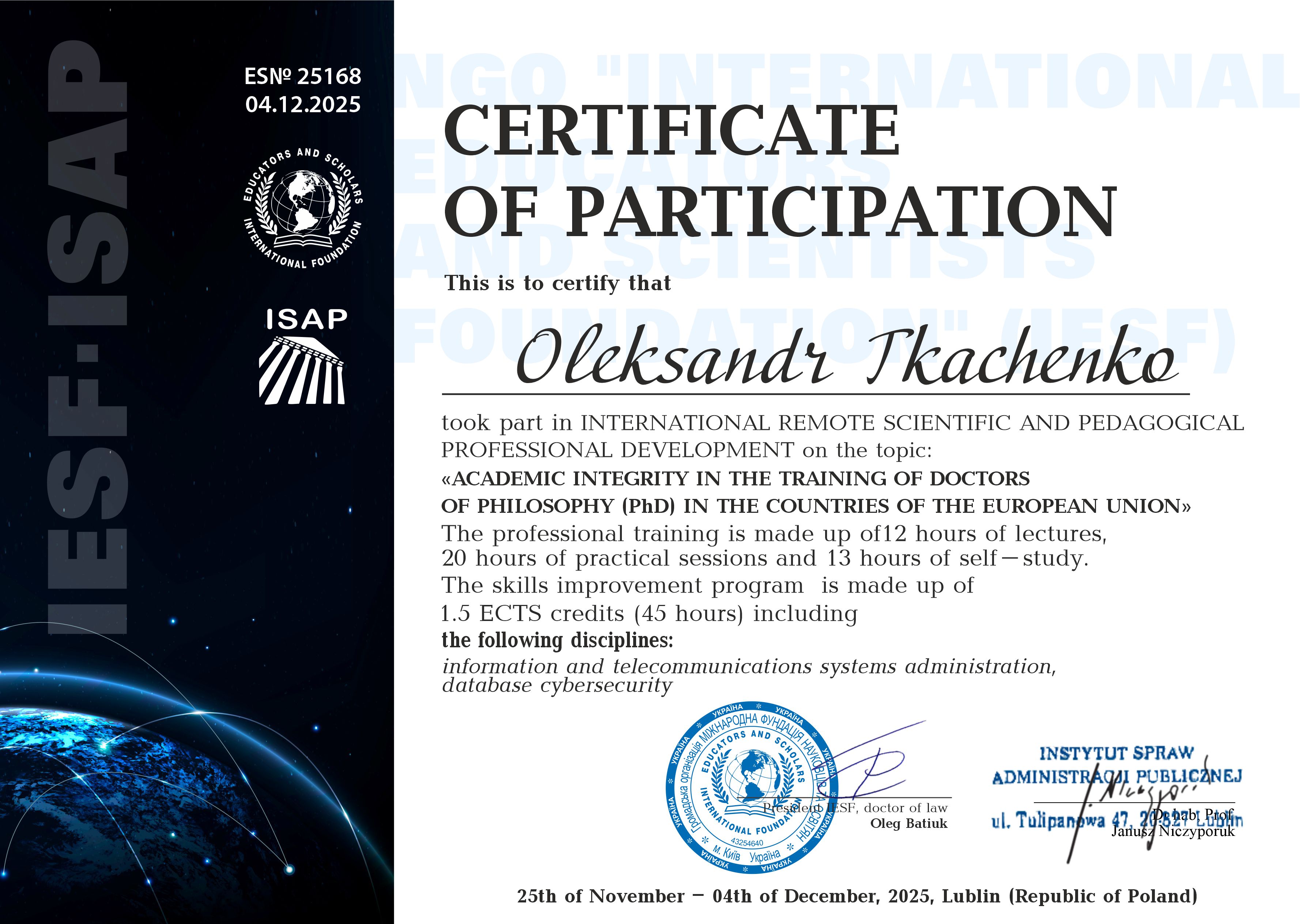2025 р. Міжнародне підвищення кваліфікації об’ємом 1.5 кредиту ECTS (45 годин). «АКАДЕМІЧНА ДОБРОЧЕСНІСТЬ ПРИ ПІДГОТОВЦІ МАГІСТРІВ ТА ЗДОБУВАЧІВ ДОКТОРА ФІЛОСОФІЇ (PhD) В КРАЇНАХ ЄВРОПЕЙСЬКОГО СОЮЗУ ТА УКРАЇНІ», яке було проведено громадською організацією "Міжнародна фундація науковців та освітян". Сертифікат