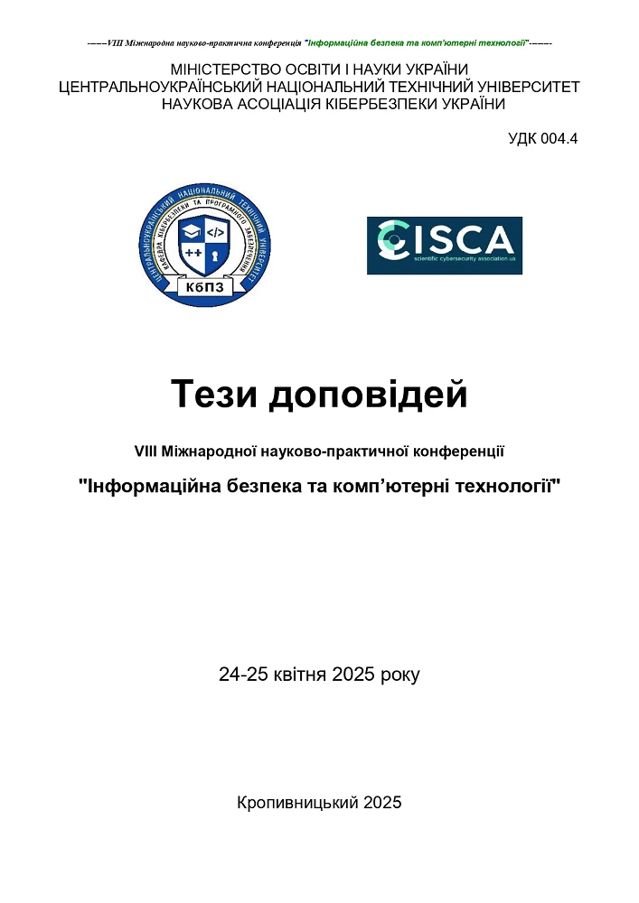 Конференції 2025 р. VІІІ Міжнародна науково-практична конференція "Інформаційна безпека та комп’ютерні технології" 2023 VІІ Міжнародна науково-практичної конференція до 30-ти річчя кафедри кібербезпеки та програмного забезпечення “Інформаційна безпека та комп’ютерні технології” 2023 VІ Міжнародна науково-практична конференція “Інформаційна безпека та комп’ютерні технології” 2022 V Міжнародна науково-практична конференція “Інформаційна безпека та комп’ютерні технології” 2022. І Міжнародна науковопрактична конференція “Цифрова трансформація суспільства”. 2021. IV Міжнародна науково-практичної конференція “Інформаційна безпека та комп’ютерні технології” 2020. Mатеріали ІІ Всеукраїнської науково-практичної конференції здобувачів вищої освіти й молодих учених “Комп’ютерна інженерія і кібербезпека: досягнення та інновації” 2020. Кібербезпека та інформаційні технології : монографія. 2020. II Міжнародна науково-практичної конференція “Інформаційна безпека та інформаційні технології” 2019. Двадцять перший Міжнародний науково-практичний семінар “Комбінаторні конфігурації та їх застосування” 2019. Міжнародна науково-практична конференція “Інформаційна безпека та комп’ютерні технології” 2018. ІІІ Міжнародна науково-практична конференція “Інформаційна безпека та комп’ютерні технології” 2017. ІІ Міжнародна науково-практична конференція “Інформаційна безпека та комп’ютерні технології” 2017. Дев’ятнадцятий Міжнародний науково-практичний семінар “Комбінаторні конфігурації та їх застосування” 2016. Актуальні задачі та досягнення у галузі кібербезпеки 2016. Вісімнадцятий Міжнародний науково-практичний семінар “Комбінаторні конфігурації та їх застосування” 2025 VІІІ Міжнародна науково-практична конференція “Інформаційна безпека та комп’ютерні технології” 2016. Міжнародна науково-практична конференція “Інформаційна безпека та комп’ютерні технології” 2015. Міжнародна науково-практична конференція “Комп’ютерні технології та інформаційна безпека” 2015. Всеукраїнська науково-практична конференція “Інформаційна безпека держави, суспільства та особистості” 2015 2014. Науково-практична конференція “Інформаційні технології та комп’ютерна інженерія” 2013. Всеукраїнська науково-практична конференція студентів та магістрантів “Сучасні інформаційні технології та програмне забезпечення комп’ютерних систем” 2013. Науково-практичний семінар “Програмна архітектура комп’ютера: актуальні задачі та наукоємні технології”